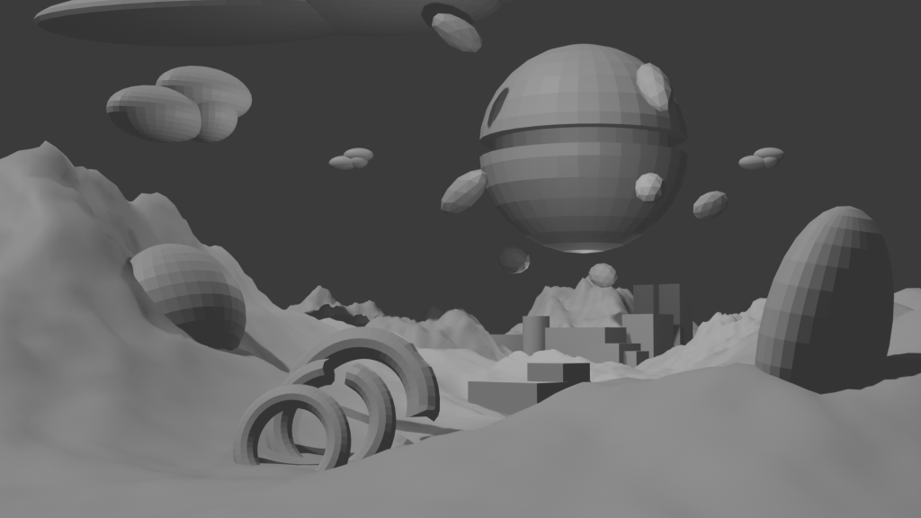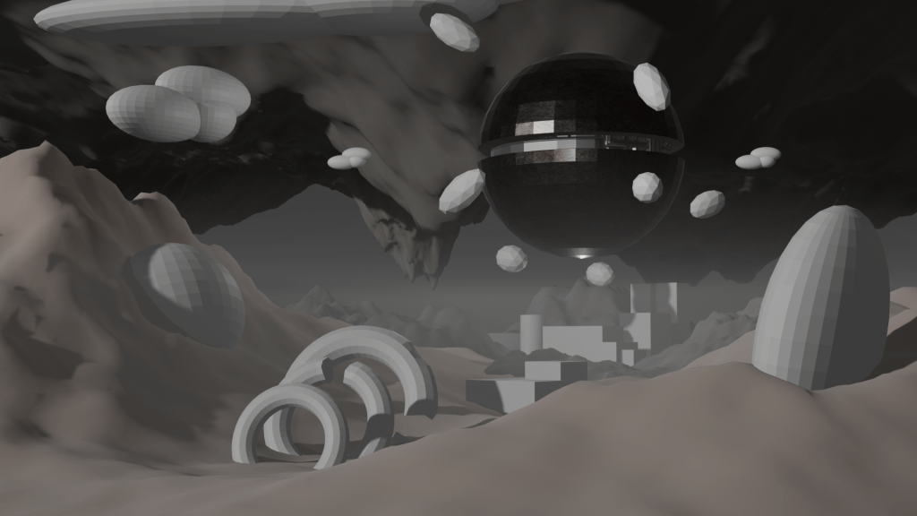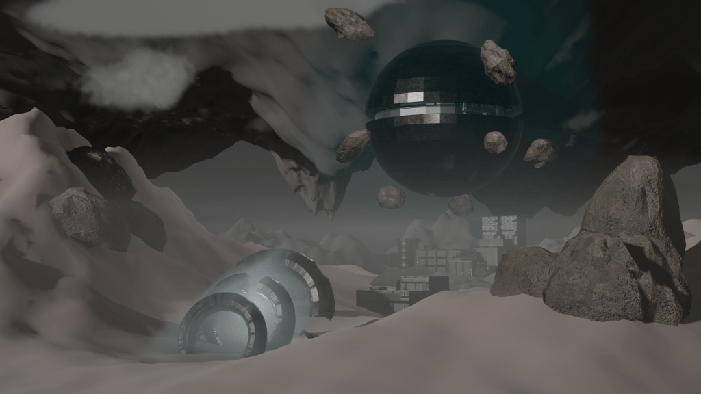 | Stage 1: I made a basic block out of the distant city and rocks, keeping a careful eye on the camera angle along with the foreground and background | Stage 2 (Landscaping): During this stage I began texturing. I also figured to change the open air aspect of the city to one underground and creating an overhang to give the illusion of it being underground. | Stage 3 (Sculpting and VFX): Finally I began with sculpting the rocks I’ve laid out and adding in the clouds. I also decided during this to add a glowing mist around the foreground ruins. |