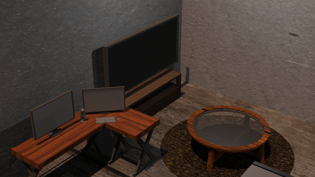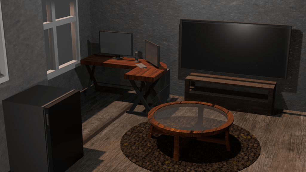 Displayed here are two angles for a scene I made during a workshop for CGMA. Our task was to create a room, either one we can see or for us to create one. I chose to recreate the area of my house where I spend my time working. Included in the scene is my work desk, dual monitors, microphone, TV, and mini fridge.